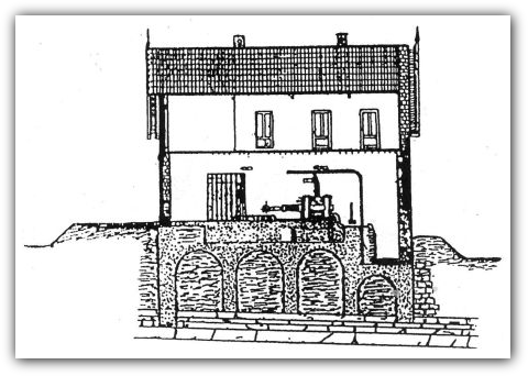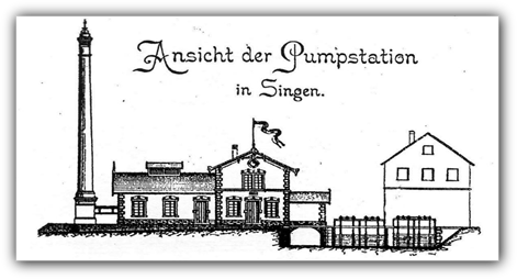 Pumpwerk I mit Dampfkamin in Singen - von August 1891 bis Mal 1892 erbautDas Gebäude wurde zweistöckig mit einer Werkswohnung, einem Maschinenhaus und einer Pumpwerksanlage errichtet.Im August 1891 konnten die Rohbauarbeiten für die gesamte Anlage vergeben werden. Die Gründungsarbeiten haben besonders beim Maschinenhaus große Schwierigkeiten bereitet.Aus Sicherheitsgründen mussten die Grundmauern des Gebäudes so tief wie die Sohle des nahen Flutkanals funda­mentiert werden. Damit war eine Gründungstiefe von ca. 5 m bei steinigem Boden vorgegeben.Um nicht zu viel Mauerwerk in diesen Boden einbringen zu müssen und um auch schneller die Gründungsarbeiten abschließen zu können, hat man vorgezogen, die Wände in Form von Bögen aus Beton herzustellen. Auf dem in nächsten Blatt dargestellten Längsschnitt durch das Maschinenhaus kann man entnehmen, dass der Boden aus Beton gefertigt wurde und auf mehreren Tonnengewölben aufliegt. Die Zwischenpfeiler sind dabei bis zum festen Baugrund geführt, um die Standfestigkeit für das Gebäude zu gewährleisten.