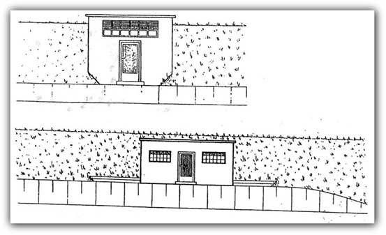 Schematische Darstellung der Behältersituation Aus dieser Darstellung kann die gesamte Funktion des Behälters entnommen werden. Die Zu- und Abgänge sind erkennbar, ebenso die Wasserkammern der beiden Behälter. Der alte mit 230 m ist nur noch bei einer besonderen Notlage in Betrieb. Eine Trennung der Behälterkammern in 2 selbständige Kammern erfolgt aus technischen Gründen, wobei die Reini­gung aber auch Reparaturen dies schon vorgeben. Diese Situation ist bei allen neuen Behältern zu finden, es ist damit die Versorgung ohne eine Unterbrechung sichergestellt.