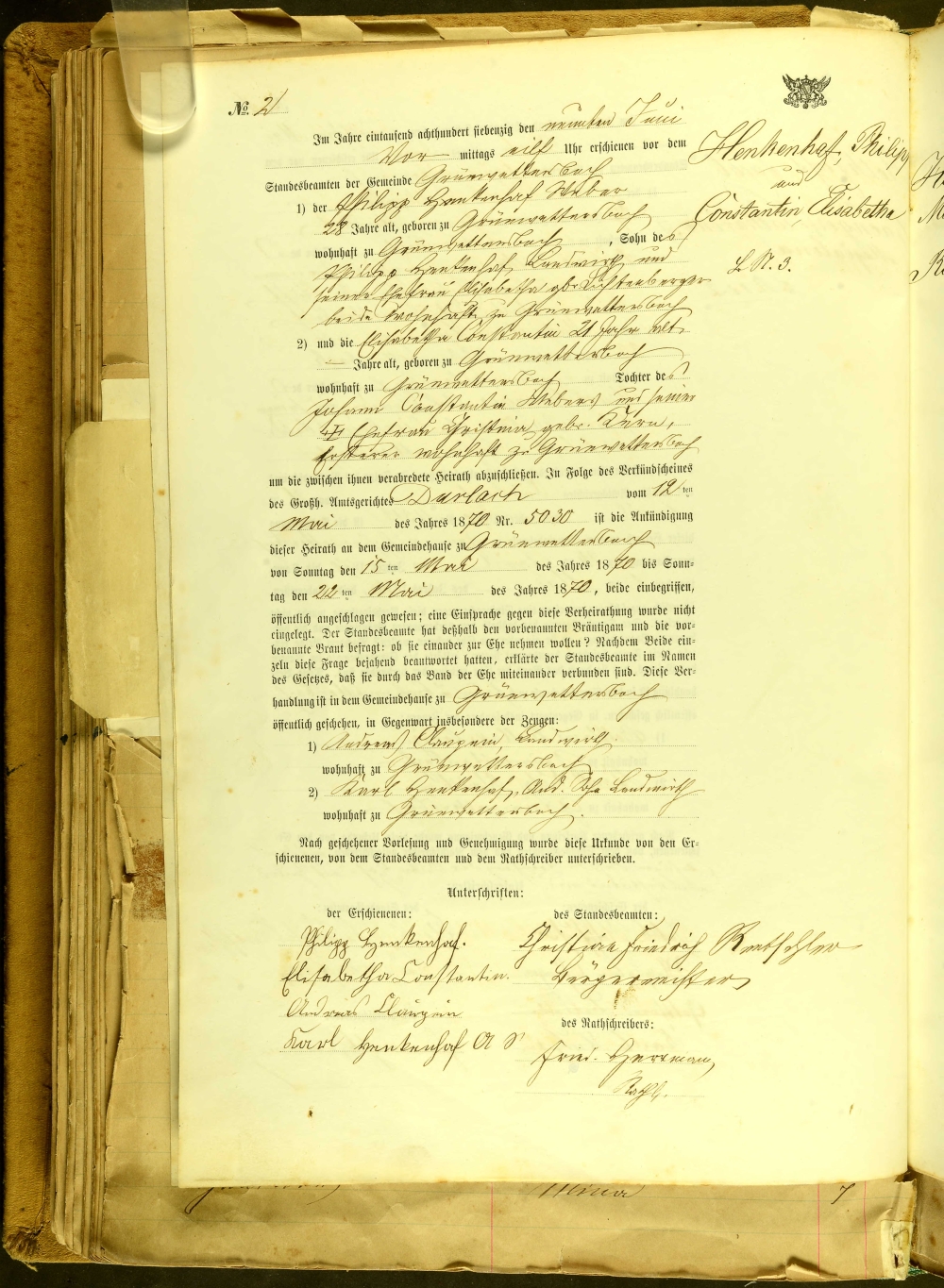 Das Grünwettersbacher Ehebuch beginnt im Jahre 1870: