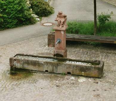 Der Brunnen an der Ecke Busenbacher Straße / Zur Dorfwies wurde mit dem Bau der neuen Schule im Jahre 1912 errichtet. Er wurde von Anfang an nur mit Wasser aus der Wasserleitung gespeist und ist kein Quellbrunnen.